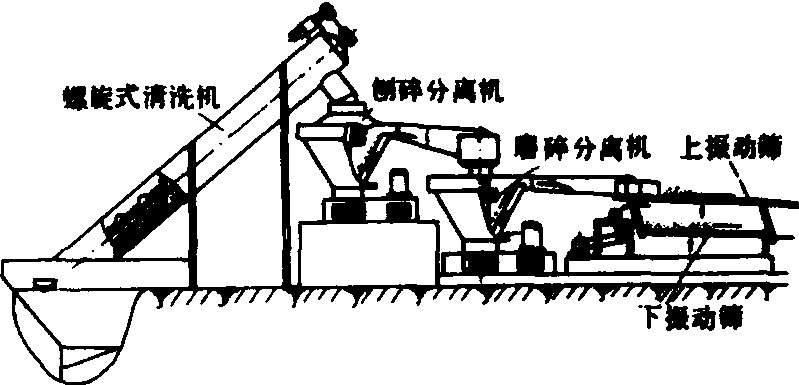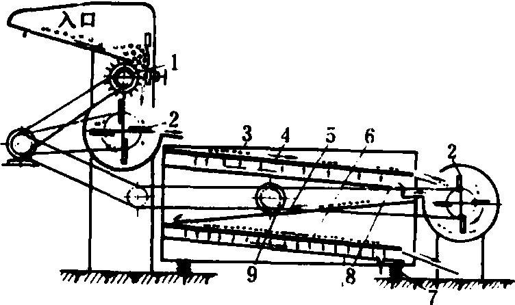 图2 小型薯类淀粉加工成套设备 1.锉磨辊;2.搅拌器;3.振动框架;4.上筛;5.斜板;6.下筛;7.弹簧支座;8.滑板;9.振动器 工作时,洗净的薯块首先被卧式锉磨辊的锯齿状磨齿破碎成纤维状薯末,使淀粉容易从薯末分离出来,再经过第一搅拌器搅拌后进入高频振动筛的上筛,由于筛面的振动和重力作用,薯渣沿筛面运动。淀粉颗粒和水穿过筛面,沿筛下的滑板排出。薯渣在第二搅拌器内加水搅拌,经下筛再次将残留淀粉分离出来。粉乳沉淀使淀粉析出。另一种为小型薯类淀粉加工机组,主要由螺旋式清洗机、刨碎分离机、磨碎分离机和振动平筛组成(图3)。薯块经螺旋式清洗机清洗去石后,进入刨碎分离机被刨成丝状薯末,经立式60°锥角的圆筛将淀粉和薯渣分离。薯渣进入磨碎分离机,砂轮磨将薯渣进一步磨碎,再由立式锥筛将淀粉分离出。薯渣进入上平筛,经第三次分离出淀粉后,薯渣进入渣池,其淀粉乳与第一、二次的淀粉乳汇合,经下筛除去细纤维,粉乳沉淀、干燥成淀粉。
