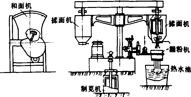图3 小型薯类淀粉加工机组 大型薯类淀粉加工成套设备 主要设备是刨丝机、冲击磨、离心筛、曲筛、碟片式离心机,卧式螺旋沉降器、旋液分离器、卧式刮刀式离心机和气流烘干设备。除第一道破碎采用刨丝机外,后续设备与玉米淀粉加工设备相同,仅是部分设备的技术参数有些差异。该设备生产规模大,淀粉提取效率高,淀粉质量好。此设备还可将马铃薯加工成小片或全粉,能保留马铃薯的全部营养成分,是加工马铃薯的重要途径,产品可作上等食品原料。 小型粉丝加工机组 将薯粉加工成粉丝或粉条的机组。包括制芡机、和面机、漏粉机等(图4)。加工时先将1/10的薯粉置制芡机内,加进热水糊化,搅拌后再放入和面机与其余薯粉加水搅匀,倒入揉面机,经3~5分钟揉合后,拉开闸门使粉团自动进入高频振动漏粉机,在高频振动下,通过漏粉板掉进热水池(水控制在微沸腾状态)糊化,调节漏粉板与热水间的距离,可以改变粉丝粉条的直径;在向漏粉机加料过程中保持加料均匀,保证粉丝直径均匀。从热水内捞出粉丝(或粉条)放入冷水池内凝沉后,捞出放到粉架上挂放晾干。