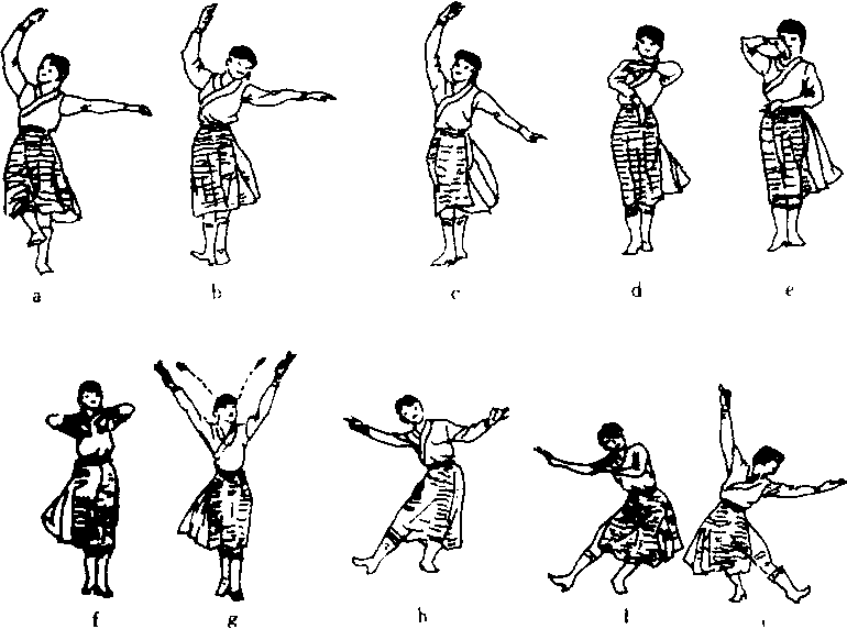 ❼献哈达(双手礼):右腿为主力腿,屈膝侧弯右脚全脚落地,左腿向8点直腿伸出,脚跟落地。双臂由腰两侧掏手向前两侧平伸开,手心向上身体前倾,头略低以示虔诚之意(图i)。