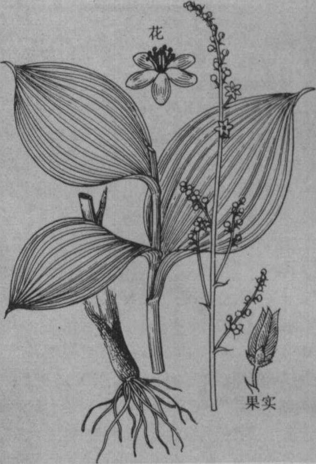 | 释义 | 藜芦rhizoma et radix veratri催吐药。出《神农本草经》。见《齐民要术》。又名梨卢、葱葵、山葱。为百合科植物黑藜芦Veratrum nigrum L.或毛穗藜芦V.maackii Regel的根或根茎。除去苗叶,晒干或用开水浸烫后晒干。中国大部分地区均产。苦、辛,寒;有毒。入肺、胃经。功能除风驱痰,催吐解毒,杀虫灭疥。主治:❶肺风毛燥,与荆疥、防风配伍,如藜芦散(《元亨疗马集》)。 藜芦black falsehellebore有毒蜜粉源植物。学名Veratrum nigrum L.。别名大藜芦、山葱、老旱葱。百合科。多年生草本,高约1米,上部被白色绒毛;基部常被有叶鞘腐烂后的残余叶脉,呈黑褐纤维状。地下宿根多数,带肉质须根。叶互生,基生叶阔卵形,长约30厘米,宽4~10厘米,先端渐尖,基部狭成鞘状,全缘。圆锥花序顶生,两性花多着生于花序轴上部,雄花常着生于下部,花冠暗紫色,径1.3~1.5厘米,雄蕊6枚,子房圆形,3室。蒴果,卵状三角形。(见图)