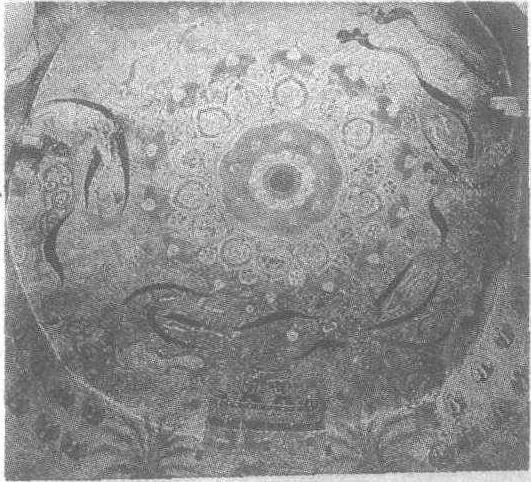 | 释义 | 藻井图壁画唐。甘肃省永靖县炳灵寺石窟第11窟窟顶壁画。藻井的正中是十几朵团花组成的大圆莲。四身飞天绕莲快速旋转,流云满布其间。飞天面形丰腴,上眼睑、双颊和下颌略施晕染。上身袒露,肌肤富于弹性,那长长的飘带增添了飞天的动感,所形成的道道弧线富有韵律。整个画面宗教气息浓厚,气氛烘托热烈,所施石绿色泽如新,使画面极为出色。