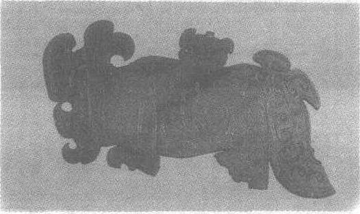 | 释义 | 虎形玉饰春秋早期。长13.4厘米,宽7厘米,厚0.18厘米。1983年河南省光山县宝相寺黄君孟墓出土。河南省信阳地区文物管理委员会藏。玉料为黄色,上有大片黑斑。玉片上琢出虎的侧面形象,张口,肢曲蹲,尾下垂(出土时尾残),呈起伏状。一面光素无纹,一面以双钩线饰花纹。虎背上另有一小虎。两虎口呈圆形可供穿系。墓主人可能偏爱虎形饰,出土共19件,分五式,此为最精致的一件。这种虎背上又立一小虎的玉饰形制并不多见。