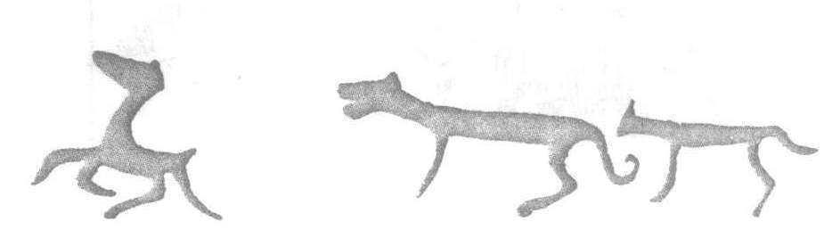 | 释义 | 虎豺逐马图凿刻于内蒙古阴山乌拉特中旗阿斯根沟南山顶石壁上,画面朝东。全画长65厘米,高27厘米,描绘三只动物,中间是一只虎(20×8厘米)。细腰长身大头,一副饥饿不堪的样子,正张开血盆大口,追赶前面的 一只小马(13×12厘米)。虎身后紧跟 一只豺(13×6厘米),尖头竖耳、细长身、高腿、短粗尾巴,作悄步行进状。前面的小马放开四蹄急驰逃命。猛虎扑食的刹那间神态,被画家(猎牧人)描绘了下来。这幅岩画的制作手法,是用钝尖工具 一点点凿刻而成的。其创作程序大概是先画出形象轮廓,然后用坚硬的石器或金属器沿轮廓一点点敲凿,由无数小麻点组成形象。麻点呈圆形,估计是用石器敲凿而成的。制作时间大概是新石器时代。从形象处理看,三只动物均取侧面,虎豺只画两条腿,比例是夸张简化的。虎的个头比马还要大,这在实际上是不可能的,但反映了原始人的思维特点。