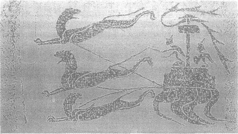 虎车 虎车,藏于南阳汉画馆,长135厘米,高80厘米,为减地薄浮雕。汉代统治阶级谶讳迷信,相信人死后会得道成仙,永享天国之乐。这种思想在汉代帛画、壁画中都有反映,像马王堆汉墓帛画中就有描绘 “引魂升天” 的画面。以鹿车、虎车为乘驭引道升天在南阳画像石中也偶有发现。这幅画像描绘了羽人(即得道成仙的人,身生毛羽)驾驭虎车奔腾升天的情景。虎是“百兽之长”,能驱邪食鬼,驾驭虎车飞腾升天岂不安全自在。这是一个十分激动人心的画面,三只生翼的猛虎拉着云车在太空中飞驰狂奔,发出阵阵长啸,后面华盖上的幡旗随风飘荡,更增加了画面紧张活跃的气氛。这幅画气势磅礴,线条飞动流畅,充满了浪漫精神和神奇色彩,不失为一件优秀之作。 |