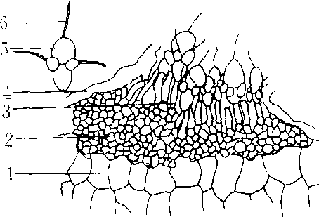 虫形孢属 1.寄主细胞 2. 分生孢子盘3. 分生孢子梗 4. 寄主表皮 5. 分生孢子 6. 纤毛 |