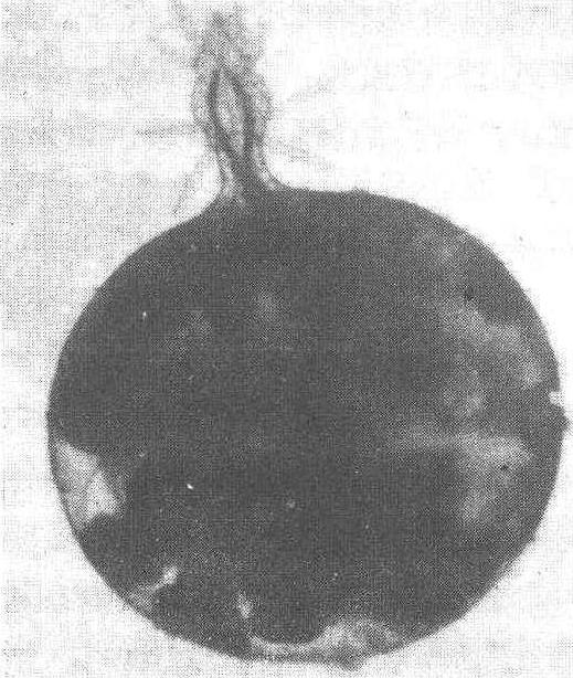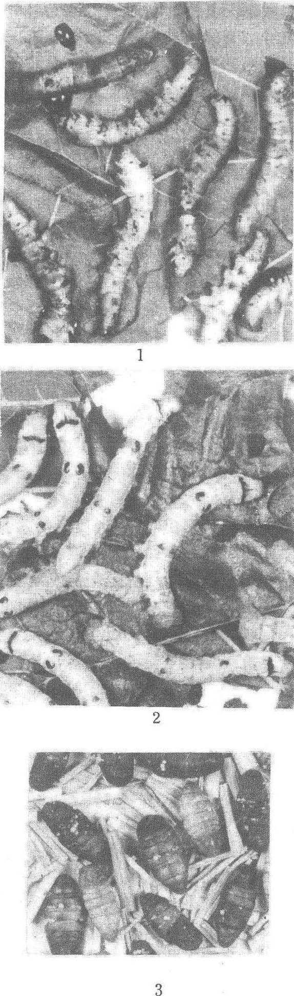 图2 大肚母螨 侵染 虱状恙螨用长而锐利的颚管刺入寄主体内,在注入毒素的同时,吸食寄主体内血液,致使寄主中毒发病死亡。虱螨主要越冬寄主是棉红铃虫和麦蛾幼虫。在棉区和禾谷类作物区养蚕,在蚕室蚕具缝隙潜藏的棉红铃虫、麦蛾上寄生的虱螨,是虱螨病的主要病源。蚕具上潜藏的越冬雌螨产出成螨可直接爬入蚕座内寻找蚕体寄生为害,蚕室壁缝隙内潜藏的越冬虱螨产出成螨,在寻找寄主的过程中爬附灰尘,随虱尘散落到蚕座内寄生蚕体为害。 病症 虱螨对桑蚕的幼虫、蛹、蛾都能为害,其中以小蚕期为害较大。小蚕被虱螨叮咬后,首先停止排粪,静伏蚕座中,口器与胸足微微颤动,呈假死状,其后体色渐渐变黑很快死亡。死后大多数头胸突出,也有表现体躯弯曲、吐水等症状,尸体不腐烂。大蚕期受害,发病较慢,但症状明显。起蚕被害,身体缩短,皮肤起皱,并有脱肛现象; 盛食期受害,蚕体软化而伸长,节间膜附近往往有黑色斑点,排不正形粪或连珠粪或深褐色污液,头胸突出,吐水,有脱肛症状出现; 眠蚕受害,其病症与虱螨寄生的迟早及数量的不同而有差异,有的不能蜕皮呈黑褐色而死亡,有的呈半蜕皮而死亡。有的虽能完全蜕皮,但体躯缩小呈黑斑蚕状,有粪粘结。化蛹初期,受害蛹体常发生黑褐色病斑,并可在环节间见到大肚虱螨,受害的蛹体成暗黑色。化蛹后期,蛹皮厚硬,不易受害。在蛾期,虱螨能寄生在蛾体的环节处,受害蛾的腹部弹力减弱。雄蛾发病后狂躁,雌蛾受害后产卵极少,不受精卵、死卵增多(图3)。