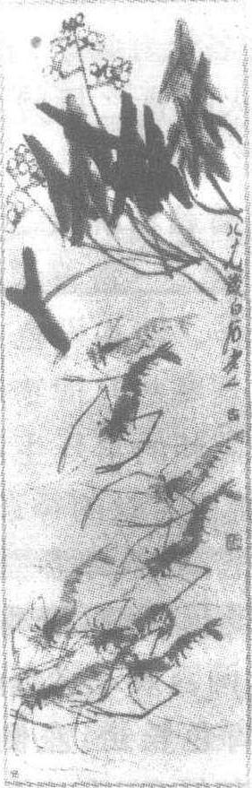 龙虾 磷虾,小型,体长3—5厘米,可发光,大洋中生活,种群密度很大,为鱼和鲸类的重要食源,也是人类尚待开发的重要渔业资源。 虾现代·齐白石作。白石老人写意画虾形神兼备,虾头3笔,左右两笔淡墨,头胸部的淡墨上加一笔浓墨,头侧左右墨眼一对,墨色深浅浓淡,水分渗透干湿,表现出晶明质感。虾身一笔一节连续数笔,节与节相接处,笔断而意连,有节奏的由粗变细;用笔多样,躬腰向前、弯腰爬行或直腰游荡,姿态各异。虾尾也为3笔,有弹力,又透明。一对前爪,由细而粗,螯形似钳,有开有合。虾须数条淡墨画出,线条似柔实刚,似断实连,宜中有曲,乱中有序。白纸为清溪,群虾在水中嬉戏游动,栩栩如生。