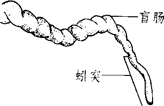 即阑尾。在盲肠末端,长十几厘米突出呈蚯蚓状。它的表面光滑,颜色较浅,没有盲肠上那种螺旋瓣;内壁较厚,黏膜表面密布隐窝。蚓突内的淋巴组织丰富,对肠道起保护作用。兔的阑尾特别发达。