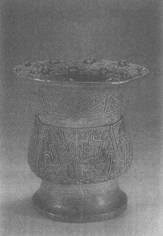 | 释义 | 蚕桑纹铜尊春秋。通高21厘米,口径15.5厘米。1963年湖南省衡东县霞流市出土。湖南省博物馆藏。尊是古代盛酒的器具。此尊侈口,膨腹,圈足。口沿上布满两条或三条一组的昂首半似立雕的蚕形。颈饰以点状纹划界的三角纹,填以斜角云纹。腹部主纹由五片图案形的桑叶组成,叶内外饰蠕动状的蚕纹。形象生动,立体感强。这种用桑蚕作为青铜器装饰的手法,仅见此例。其铸作技艺尤为超绝。