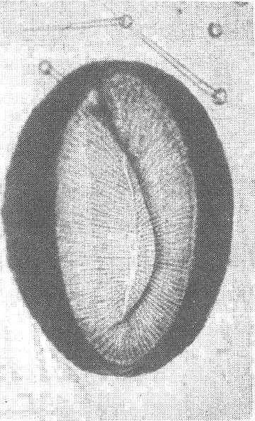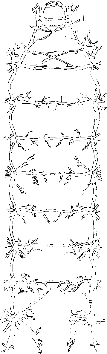 图1 幼虫气门外观 蛹有8对气门。分别位于第1胸节和第1~7腹节体躯两侧。长椭圆形。筛板退化。 成虫也有8对气门,也在第1胸节和第1~7腹节体躯两侧,每环节一对。新月形、无筛板。腹部气门向后弯曲,气门前缘及后缘上半部骨质化,后缘下半部是膜质。前胸气门向前弯曲,气门前后缘的构造与腹部气门相反。气门的开闭装置仅有闭杆、闭带和开、闭肌构成。此外,在前后翅基部交界处也有一对无骨质外缘、仅由前后膜瓣构成的退化气门,无开闭装置,其开闭运动主要靠中、后胸背腹肌的收缩实现。 气管 幼虫气管包括气管丛、纵走气管、横走气管、气管分枝及微气管等,在蚕体内形成气管系统。气管丛是各气门内气管发出放射状分枝的部分,共10对,连接前后气管丛较粗大的是纵走气管;从各气管丛向腹面以水平方向延伸到腹中线的是横走气管;第1、第2、第3对气管丛发出的横走气管还在第2、第3胸节腹中线处左右交叉会合;在前后两气管丛纵走气管之间及左右横走气管在腹中线的会合处均以气管灰白部连接。气管丛及横走气管向前后发出气管分枝,分布到蚕体背面、腹面、内脏器官和头腔内;气管分枝一分再分,愈分愈细,当直径达2~5微米时,进入一个掌状的端细胞,在端细胞的胞质内又行分枝,形成若干直径小于1微米的微气管,伸入器官的组织间或细胞内(图2)。 成虫气管与幼虫相似,不同之处是: 气管丛只有9对; 头部及胸部气管比幼虫发达; 第1、第2、第3对气管丛所发出的气管在前翅和后翅基部形成两个会合,其分枝还分布到翅及第2、第3胸足中;气管会合处无灰白部。此外,分布到腹部环节间接近体壁的局部气管,扩大成气囊状,以扩大吸气和排气的容积。 气管构造 幼虫气管呈紫褐色,基本结构与体壁相似,只是内外层次相反。最外面是一层非细胞结构的底膜,多角形扁平细胞组成中间的管壁细胞层,里面是表皮质内膜。管壁细胞内有一个球形细胞核,细胞质中含有淡褐色的色素粒。在蜕皮过程中,管壁细胞呈活泼分泌图2 幼虫腹面气管的分布状态。内膜局部增厚形成 1~9为第1至第9气管丛黑褐色富有弹性的螺旋 (1)为退化气门的部位丝。使气管腔保持扩张状态。微气管的结构与气管相同。气管灰白部无螺旋丝。内膜上有许多毛状突起。幼虫蜕皮时,旧气管内膜在灰白部断裂,并由所在环节的气门脱出,新内膜在眠期由管壁细胞分泌形成。