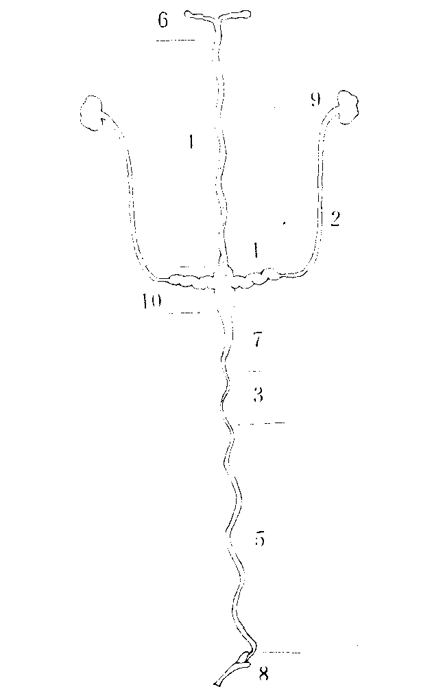 雌性生殖器 雌蚕内部生殖器由卵巢、生殖导管、生殖芽(石渡氏腺)所组成。卵巢位于第8腹节背面,背管两侧、 左右成对,略成三角形。卵巢内初分4室,3龄后形成4条卵巢管。从每个卵巢外侧顶点,各伸出一条生殖导管,由腹面沿纵走大气管向后延伸,到第7腹节,从气管丛弯入,对称地附着在第7腹节后缘的体壁上。在4龄后期及5龄蚕的第8和第9腹节腹面,可看出各有一对乳白色囊状小体附着于体壁,即前生殖芽及后生殖芽。 在蛹期变态中,雌蛾内部生殖器在化蛹后第2~3天,卵巢管显著伸长,使卵巢膜破裂,卵巢管脱出,游离在体腔内,每一管内成长卵约50~90粒。生殖导管特别缩短变成输卵管,前生殖芽发育形成产卵管前部、交配囊、受精囊,后生殖芽发育成产卵管后部和左右一对粘腺。产卵时,粘腺分泌液附在卵的表面,使卵产下时能粘着在物体上(图2)。