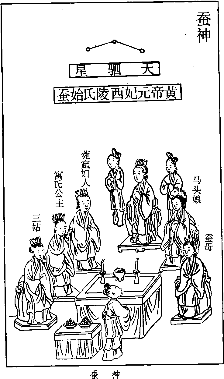| 释义 | 蚕神Seri-goddess中国古代传说最早教民养蚕的神示。当人们掌握养蚕技术还处在初级阶段时,往往把收成的好坏寄托于不可捉摸的神灵或意想中的养蚕发明人或蚕的化身,对他们产生崇敬的心情。商代的蚕神叫蚕示,祭祀时用3牛、3对雌雄羊,甚至还用杀了的羌奴来祭祀。周代,养蚕前祭祀先帝。汉代用猪羊祭蚕神菀窳妇人和㝢氏公主。待至北朝、北齐用一牛祭黄帝轩辕。北周以一牛祭奠西陵氏。唐代因干宝《搜神记》上曾记载一则蚕由马变成的神话,因此“以先蚕为天驷”。南宋时沿袭北周的习惯,把西陵氏之女祀为先蚕。元代《王祯农书》载:“蚕神,天驷也”、“黄帝元妃西陵氏始蚕,即先蚕也”。明清两代,各地祭马鸣王菩萨的很多,清代祭祀嫘祖的也不少,且同一地区,祭祀马头娘(马鸣王菩萨)和嫘祖的都有。四川相传蚕丛氏为蜀侯,后称蚕王,经常穿着青衣,巡行郊野,教民养蚕。乡人立祠祭祀,称做青衣神。