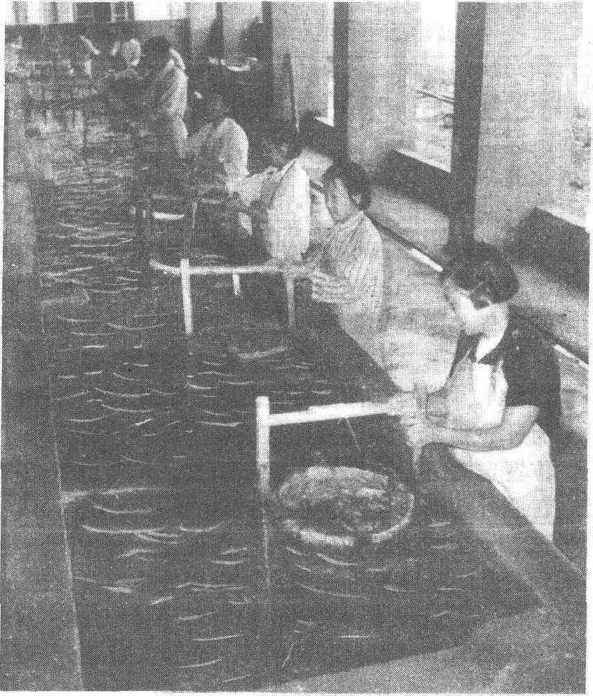图2 蚕种脱酸 由于作业安排或其他原因,需要推迟浸酸时,可在预定施行浸酸前1~2小时,进行冷藏抑制,冷藏温度5℃,最长抑制日数不超过3日。又浸酸后蚕种,需推迟催青收蚁时,可于浸酸后经18小时(保护温度24~25℃)冷藏抑制,先在中间温度15℃中保护4~6小时,再用5℃冷藏。可冷藏30日,但在浸酸后经过40小时冷藏的,冷藏安全期稍短,不宜超出20日。 即时浸酸的另一方法是室温浸酸。此法盐酸不加温,依一般室内温度浸酸,具有节约能源,浸酸处理安全的优点。在前述同样产卵的经过时间,初夏一般室温下,盐酸液温27℃,比重为1.110,浸渍时间为60~100分。当液温高到29℃时,浸渍时间宜缩短为40~60分钟,对平附种或框式种进行室温浸酸时,必须先将蚕种在2%的甲醛原液中浸2~3分钟后再浸酸,以防止蚕卵脱落。 |