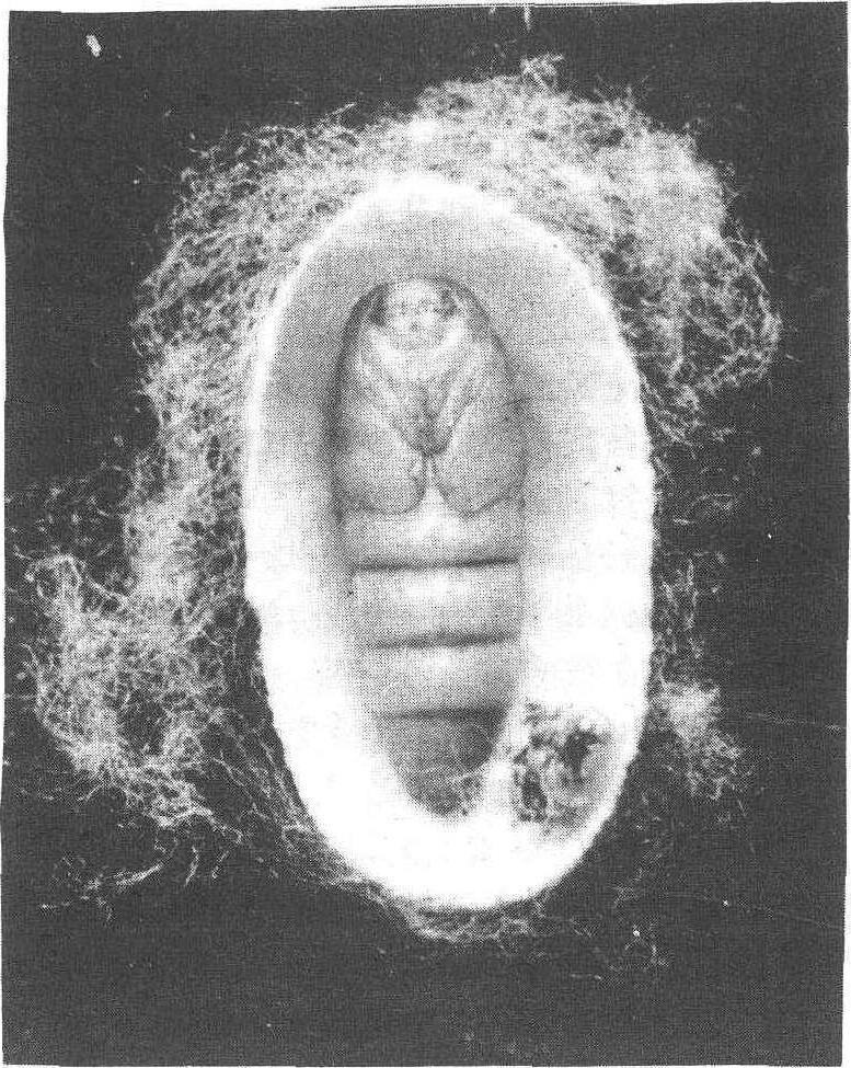 蚕茧剖面图 为上茧、次茧和下茧;依茧的干燥程度可分为鲜茧、半干茧和适干茧。供缫丝生产的原料茧,均由鲜茧烘成适干茧,并按不同产地、季节、品种划分成庄口(指一个茧站所收烘的茧量)。缫丝前还需进行精选和调整,使其成为茧质相近、可以缫制批量生丝的原料。通常以上茧缫制高等级生丝,次茧缫中低级生丝,双宫茧单独或同次茧一起缫制双宫丝或做丝绵。一个茧的茧丝长度通常在1,000米以上,是天然纤维中最长的纤维。并具有吸湿与散湿的优良性能,缫成的生丝可织成各种绸缎服饰,绚丽多彩,穿着舒适。并可用于美术工艺外科缝线和其他工业。蚕茧副产物如下茧、汤茧、蛹衬(滞头)、茧衣、废丝等可作绢纺、丝绵或高级化妆品原料。蚕蛹可供提取蛹油、制药或供喂养猪、鱼、家畜等综合利用。蚕茧丝绸产品的主要原料,包括桑蚕茧和柞蚕茧。中国种桑养蚕具有悠久的历史,蚕茧产量约占世界的60%,1996年中国蚕茧产量为50.8万t,其中桑蚕茧47.1万t。主要产区是四川、江苏、浙江、广东等地。鲜茧加工成干茧的制成率为38%,每7.8t鲜茧产丝1t。每个桑茧丝长为800~1000m,蚕丝的比重为1.33。平均纤度为2.5~3旦,柞蚕茧丝长为800m左右,平均纤度约5.6旦。 |