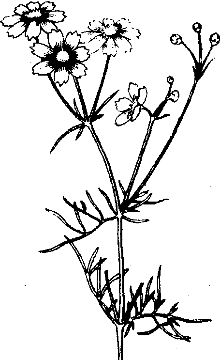 蛇目菊plains coreopsisCoreopsis tinctoria Nutt.,菊科,金鸡菊属。一年生草本。原产北美。中国栽培较普遍。株高60~100 cm。茎光滑细长多分枝。对生叶二回羽状全裂,裂片线形。头状花序具长总梗,合生为聚伞花序状;盘心花暗紫色,舌状花单轮,先端有浅齿裂,黄色,基部红褐色。花期6~8月,暖地可全年开花。瘦果纺锤形。2n=24。不耐寒冷和炎热,但能耐干旱和瘠土。通常春播,管理简易。适用于花坛、花境及地被,也可任其自播用于野趣园。同属常见的观赏种还有金鸡菊,舌状花黄色,基部浓红色;大花金鸡菊,宿根性,花色鲜红,2n=26;剑叶金鸡菊宿根,花金黄色,2n=24或48。 |