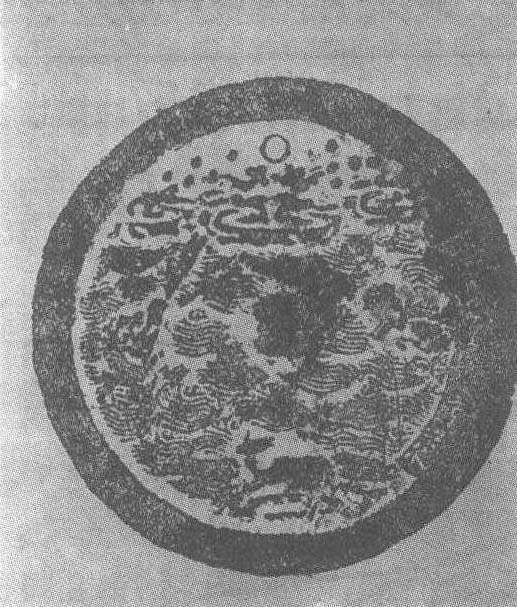 | 释义 | 蛟龙闹海铜镜宋。直径15.58厘米,边厚1.4厘米。重775克。1984年河南省宝丰县出土。河南省宝丰县文化馆藏。铜镜圆形,背面正中有圆形素钮,钮外饰蛟龙闹海图:钮上方浮云飘动,明月当空,星斗闪耀。钮左右惊涛骇浪中一水柱直冲云端,有一蛟龙正喷水嬉戏。钮下海浪拍岸,一海兽惊恐奔逃于怪石之间,并回首窥视。钮右也有狂浪中挣扎的同类。右边沿阴刻有铭文“承直郎河北西运户判监铸梁作”共计13字。“梁作”表明由梁氏官工监作,是官铸铜镜。