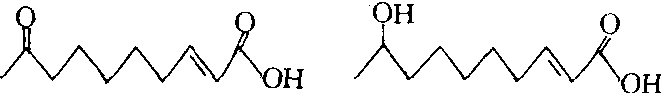 | 释义 | 蜂王物质queen substance蜂王上颚腺分泌的起传递信息作用的化学物质。主要成分是,反式9-氧代-2-癸烯酸(简式9-ODA)和反式9-羟基-2-癸烯酸(简式9-HDA),其化学结构式如右。当工蜂饲喂蜂王时,借彼此口器的接触,蜂王把蜂王物质传递给饲喂蜂,再通过工蜂间频繁的食物传递,而传遍所有的工蜂。该物质起抑制工蜂卵巢发育和抑制工蜂筑造王台,使工蜂感觉到蜂王的存在等作用。人们按这种信息素的传递方式,又将蜂王物质称为口授信息素。