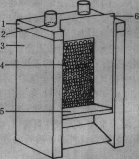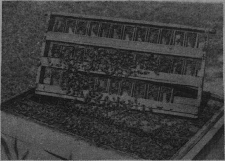 图1 将贮存蜂王分别装入贮王框的王笼内 受精蜂王的贮存 已经交配的蜂王,可以采取下述方法贮存数周到数月。 室内贮存 要求环境安静,保持黑暗,空气新鲜。❶无王群贮存: 采用10框标准箱,关闭巢门,放入1千克工蜂,上盖纱盖,用玻璃酒杯或透明塑料杯将蜂王分别扣在纱盖上。将蜂群放入25~30℃的暗室内,饲喂花粉、水和糖浆。每隔二三十天更换一次工蜂。 ❷用贮王盒贮存:盒用木制或塑料制成,内宽60毫米,深35毫米,高80毫米,前装可抽出的玻璃门,盒上装小型饲料瓶(图2)。在盒内粘一块小巢脾,放入一只蜂王和40~60只工蜂。贮王盒放在黑暗、通风的柜橱内,适宜温度15~17℃,相对湿度50~70%。每二三十天更换一次工蜂。 ❸小继箱贮存:用厚10毫米的木板钉制小继箱,内长80毫米,宽80毫米,高60毫米。两块100×100毫米的方板作底和盖。小继箱内放两个小巢框,一个镶入空脾,一个镶入蜜脾。放入一只蜂王和40~60只工蜂。每隔二三十天更换工蜂时,可将工蜂放入一只新的小继箱内,加在原小继箱上,中间加一张纸,使两箱工蜂自然合并,同时清除死亡工蜂。