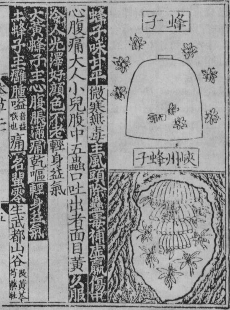 蜂子 泛指蜜蜂的幼虫和蛹,又称蜂胎。中国古代早就食用蜂子并用于医疗保健。《神农本草经》将蜂子列为上品补益剂。宋《重修政和经史证类备用本草》卷二十载蜂子“味甘平,微寒,无毒,主风头,除蛊毒,补虚羸伤中,心腹痛,大人小儿腹中五虫口吐出者,面目黄,久服令人光泽、好颜色,不老,轻身益气”(见图);又载:“陈藏器本草云蜂子主丹毒、风疹、腹内留热、大小便涩,去浮血、妇人带下,下乳汁,此即蜜房中白如蛹者。”蜂幼虫和蛹的组织中含有丰富的营养物质和蜕皮激素、保幼激素,蜂王幼虫所含氨基酸的种类与王浆相似。近代各国利用蜜蜂幼虫和蛹加工成各种食品和药品,适用于一些疾病的辅助治疗,也可作为保健品。(见蜂子制品)