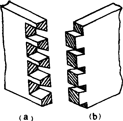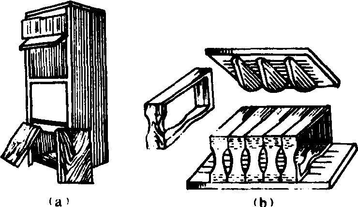 图1 П.И.普罗科波维奇柜式蜂箱 1851年美国L.L.郎斯特罗什发现了蜂箱壁与巢框、巢框与巢框间留有一定的距离后,就能避免它们相互粘连在一起的现象。根据这一原理,他设计制造了第1个实用的活动巢框蜂箱。1853年在他著的《郎斯特罗什论蜂箱与蜜蜂——一本养蜂者手册》一书中介绍了这种蜂箱。蜂箱从上顶开启,巢框在这种蜂箱里被设计成悬挂着的,彼此之间并与装巢框的蜂箱之间保持着一定的距离(见蜂路)。人们称这种可以相互交换和移动的巢框为活动巢框,这种蜂箱为活框蜂箱或原始郎氏蜂箱。由于这种蜂箱的巢框具有适于蜜蜂的生活习性、可以交换使用、移动自如、收获蜂产品不会毁坏巢脾、使用寿命长、取蜜方便等优点,很快被人们所采用。到1861年美国已普遍使用这种活框蜂箱,以后又被介绍到欧洲,传播到其他国家。活框蜂箱的出现是养蜂史上的一个重大转折点,是科学养蜂的开端,极大地促进了养蜂生产的发展。 此后世界各地就在同一基本原理下制造出不同类型的蜂箱。现在普遍使用的各种蜂箱有:西方蜂蜂箱有十框蜂箱、达旦蜂箱、定地转地两用蜂箱、十二框方形蜂箱、卧式蜂箱等;中蜂蜂箱有中华蜜蜂的十框标准蜂箱(见中华蜜蜂蜂箱)、从化式中蜂蜂箱、沅陵式中蜂蜂箱、高窄式中蜂蜂箱、中一式中蜂蜂箱、中笼式中蜂蜂箱等。蜂箱的大小和巢框的大小、多少虽有不同,但结构原理则基本一致。19世纪末到20世纪初,西方蜜蜂中的意大利蜂与养蜂用具、养蜂技术同时传入中国,此后中国的养蜂业逐渐以饲养西方蜜蜂为主,大部分所使用的蜂箱也是原来饲养意大利蜂所用的十框蜂箱。(见世界养蜂史) 现代蜂箱的结构 呈长方体形,最下部是箱底,其上是巢箱。巢箱的前壁下部与箱底处有巢门,是蜜蜂出入蜂箱的主要通道。巢箱之上是继箱,继箱有深继箱与浅继箱两种。根据蜂群情况,继箱可不叠加或叠加一个至多个。最顶层是箱盖。箱盖里面还有副盖。巢箱与继箱中均可悬挂巢框,蜜蜂在巢框里的巢础上筑造巢房,以供生活与繁殖。巢脾与巢脾、巢脾与箱壁之间的空间留有蜂路。 根据巢框的尺寸与各部分蜂路的大小,可确定蜂箱的内围各部分尺寸如下: 内长=巢框外长(不计框耳)+前蜂路+后蜂路………(1) 内宽=容纳巢框数量×上梁宽+框间蜂路+隔板闸板厚度及其蜂路………(2) 内高=巢框高度+上蜂路+下蜂路…… (3) 制造蜂箱的基本要求 蜜蜂常年生活在蜂箱里,并在其中繁殖、抚育后代,储备食料,所以要求蜂箱内能保持适当的温度、湿度和良好的通风条件。蜂箱长期在露天放置,经受日晒雨淋,转地饲养时蜂箱经常搬动、碰撞,因此要求蜂箱能坚实牢固,经久耐用。必须选用坚固、质轻、不易变形、绝缘性良好的木材制作蜂箱。中国北方以红松、白松、椴木、桐木,南方以杉木为宜。美国与欧洲国家多采用松木。应避免选用气味浓烈、容易弯曲变形或开裂的硬杂木。木料要充分干燥后,再制作蜂箱。板材要求组织细密、光滑、无节疤、无蛀孔、无裂纹,力求板面宽大。若选用整板制箱,箱角采用鸠尾榫或直角榫连接(图2)。若缺整板,则在拼接木板时要采用企口缝(凹凸企口)或裁口缝( ![]() 企口),以求连接紧密。木板拼接好后,再用上述方法连接箱角。蜂箱表面可以涂刷白漆或桐油,以防雨水渗漏与日久开裂。蜂箱各部分的结构与尺寸大小应符合标准化要求,统一规格,以便蜂箱部件交换使用,操作管理方便,以及使用配套的蜂机具。世界上不少国家和中国都研究用塑料代替木材制作蜂箱,研制品已有出售,有的已使用多年。这些作法尚处于试验阶段,有待进一步研究。