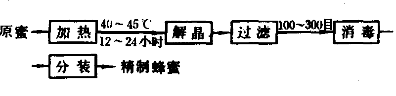 | 释义 | 蜂蜜加工bee honey processing以天然蜂蜜为原料,通过加热、解晶、过滤及消毒等工序制成精制蜂蜜的过程。加工时要求营养成分不受损失,并且不影响蜂蜜原有的色、香、味。蜂蜜加工的工艺过程如下: