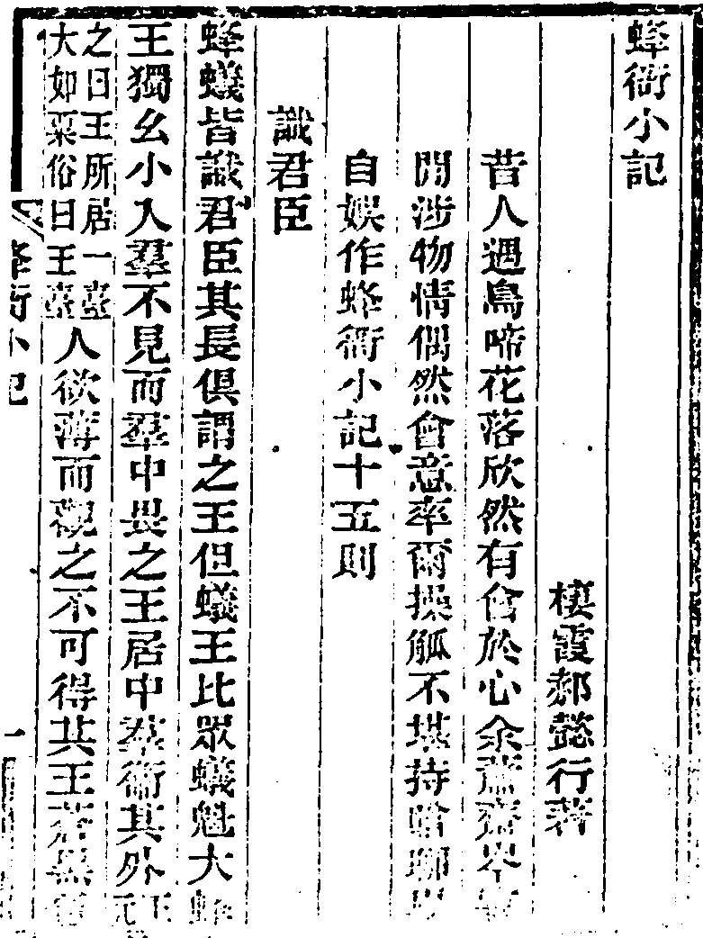 《蜂衙小记》(清光绪刻本第一页书影) 《蜂衙小记》收在《郝氏遗书》(清嘉庆至光绪年间刊刻),有光绪五年(1879)刻本,具体写作年代不可考。该书正文前有一小序:“昔人遇鸟啼花落,欣然有会于心;余萧斋岑寂,闲涉物情,偶然会意,率尔操觚,不堪持赠,聊以自娱,作《蜂衙小记》十五则。”简要地说明了他写作《蜂衙小记》的背景与动机。 序中所提“《蜂衙小记》十五则”,包括:识君臣、坐衙、分族、课蜜、试花、割蜜、相阴阳、知天时、择地利、恶螫人、祝子、逐妇、野蜂、草蜂、杂蜂。全书约1700字,文字简明扼要,类似现在的科学小品。但内容却较充实,涉及有关蜜蜂及养蜂的诸多问题,对今天仍有参考借鉴作用。 蜂喜聚群而居,在“坐衙”一则以封建王朝的君臣关系为喻,描述了蜂群的这种特性:“蜂所居曰衙,色如凝脂,密过莲房,千门万户,累累如贯,亦号蜂房。”蜂衙中有蜂王,“王坐衙则群响应”,朝则“群蜂皆起飞翔户外”,暮则回衙,指明了蜂群是许多蜂组成的既有分工、又相互依存的有机整体。 养蜂首先要选择好场地,注意周围的环境条件。该书“择地利”中提出:“蜂所居必吉地”,即适宜养蜂的场所,使蜂如同进入“乐土”一样,然后才能“定居”。场地宜靠近蜜源植物,地势高爽,开朗,通风,清洁;还强调“凡蜂所居每十余日必为扫除,不则生虫蛊”。这些仍然是现代养蜂所必须注意的。 作者在“试花”一则中写道:“蜂之恋花尤甚于蝶,凡花初开,其中有一点甘露芳馥之气,蜂虽远无不闻,闻则麋至,蕊未吐乃穴而入,借露濡体,还裹其花,复穴而出,则体尽黄。……尤勤者贪裹不出,至体累垂不能举,足股皆满。”因为蜂采蜜“于花无损”,人们并不厌恶它,乐于“听蜂声满院,与禽声互答”。形象逼真地描绘了蜜蜂采花蜜的生动情景。 收取蜂蜜是养蜂工作中的重要一环。作者在“割蜜”一则中说:“蜂善偷花,人善盗蜜”,人“盗”蜜的办法是“先用艾火熏之,蜂则避聚一处守其蜜,而不知人已盗之矣”。割蜜还要选择,“善割者”注意不使蜂受伤,还应“无令其尽”,“必留数停,使足御冬,名曰蜂粮。”如将蜜取尽,蜂群就会冻饿死亡。 《蜂衙小记》作者郝懿行,生活在封建社会末期,由于受时代的局限,他的著作中也有一些非科学和封建迷信的内容,如“知天时”中说:“蜂忌老人,如有老人之家蜂乃不蕃”;“祝子”中又说:“蜂,祝而生者也。”即经常祷告蜂群才能繁盛。但综观全书,《蜂衙小记》仍不失为一部较有价值的养蜂专著。 《蜂衙小记》Jottings on Bee-Keeping清代关于养蜂的专著。著者郝懿行(1755~1823),字恂九,号兰皋,山东栖霞人。嘉庆进士,官户部主事。《蜂衙小记》一卷包括识君臣、坐衙、分族、课蜜、试花、割蜜、相阴阳、知天时、择地利、恶螫人、祝子、逐妇、野蜂、杂蜂等15条,末附牟廷相跋文。记叙了蜜蜂的形态、生态、生活习性和采蜜方法,是中国古代唯一的养蜂专著。但内容简略,且有一些错误,“逐妇”条误“雄蜂”为“雌蜂”便是一例。有光绪五年(1879)东路厅署刻本,收入《郝氏遗书》中。 《蜂衙小记》A Sketch on Beekeeping清代养蜂的专著。郝懿行(1757~1823)撰。懿行字恂九,号兰皋,山东栖霞县人,嘉庆进士,官至户部郎中。是著名的经学家和训诂学家。全书一卷,成书年代不详。主要讲蜂的生活及养蜂事项,共15条,性质似小品文。是中国古代唯一的一部养蜂专书。 |