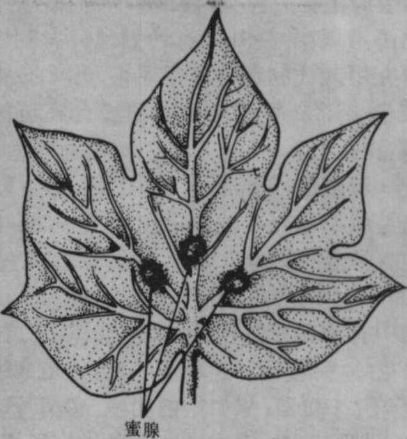 图2 棉花叶脉蜜腺 蜜腺nectary植物体上分泌含糖甜液的外分泌组织。其形状、大小、颜色和所在位置因植物种类不同而异。由表皮层及下面的分泌细胞群组成,或由数层特化的表皮层细胞群组成。细胞较小,排列紧密,无细胞间隙,细胞壁薄,无液泡或极微小,含有大量线粒体。位于花朵上或花序上的蜜腺称为花蜜腺,是蜜蜂采集的主要对象。位于茎、叶(叶柄、叶片或托叶)上的蜜腺称为花外蜜腺,如棉花叶脉蜜腺及橡胶树、田菁和南洋楹总叶柄上的蜜腺等少数植物的花外蜜腺,能分泌蜜汁供蜜蜂采集利用,多数植物的花外蜜腺对养蜂生产没有意义。 |