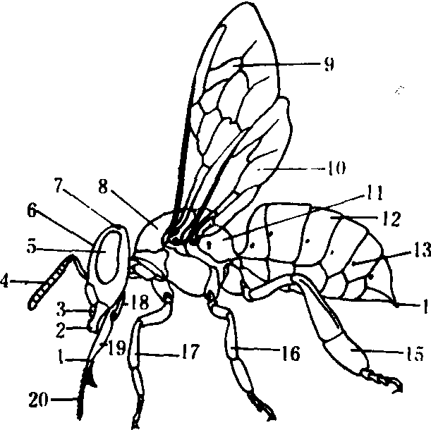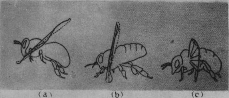 图11 工蜂腹部 螫针 蜜蜂以螫针为自卫器官。工蜂的螫针由产卵器特化而成,通常包含在腹末第7节背板下的螫针腔内(图12),由可外露的螫针杆和一个大的基部结构组成。螫针杆由三个可分离的部分组成,上面中背部分由一对内产卵瓣演变成一根腹面具沟的刺针,下面由成对的腹产卵瓣演变为两根上表面具槽的感针,并列于刺针的两下边缘。感针上表面的槽紧密地咬合住刺针下表面沟的轨道状边缘,使感针可在轨道上来回自由滑动。两根感针的下缘也互相啮合,并与刺针一起形成一条从针杆基部的螫针球通到末尖端的导管,称毒液管。刺针的端部有3对小侧齿;每一感针近基部结构由螫针球、碱腺、毒囊、一对弯曲臂以及与其关连的3对形状不同的骨片组成。毒囊接受毒腺的分泌液,并有管道通入螫针球。球部的臂悬挂和支持针杆,并控制感针的滑动。3对骨片,即方形板、三角形板和长方形板是螫针的发动装置,在它们的协同动作下,当螫针不使用时完全缩进腹部螫针腔中的螫针球基部,末端被其两个延伸叶——螫针鞘包住。当使用时,可使针杆从腹部伸出;在螫针插入敌体后,由于刺针和感针的上下滑动,使针越刺越深,由于感针具有倒钩不能退出,以致将整个螫针及其基部结构一起和蜂体分离,留在敌体上,这时,连接螫针和毒囊的肌肉在交感神经作用下,还会有节奏地收缩,螫针继续深刺和射毒,直至把毒液全部排出为止。工蜂失掉螫针不久就死亡。蜂王也有由产卵器特化而成的螫针,略呈弯曲且稍粗长,但倒钩小且少,毒腺和毒囊也不如工蜂的发达。雄蜂无螫针。