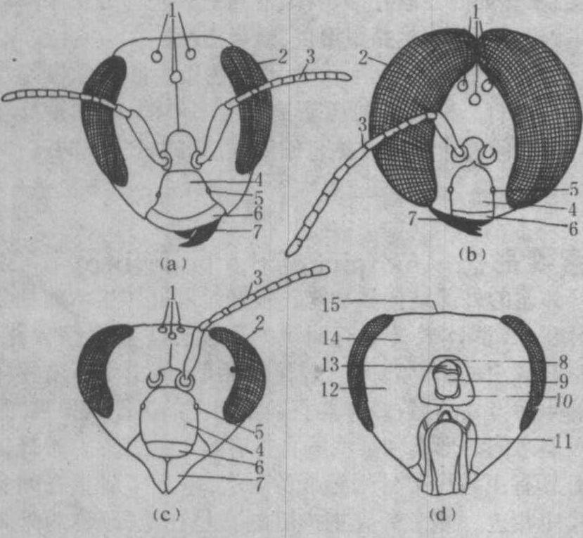 图1 蜜蜂的外部形态(除去被毛) 头部 成虫头壳看起来是一片连续结构,从胚胎发育表明,也像胸部和腹部,由几个紧密结合的体节组成(有4节和6节两种见解),附有触角、上颚、下颚和下唇。下颚和下唇结合在一起时形成喙,是吸取液体食物的器官。头部上方两侧有一对复眼,复眼之间有3个单眼。头部是摄食和感觉的中心。 头部构造 蜂王、雄蜂和工蜂的头部形状各不相同(图2)。蜂王的头部呈心脏形,雄蜂的头部由于复眼大而突出,呈圆形,工蜂头面呈倒三角形。蜜蜂的头部由前至后渐平,一对复眼着生于头的上方两侧;头顶有三个单眼呈倒三角形排列,颜面隆起。一对触角着生于颜面中央的触角窝;触角基部下方有明显弯曲的口上缝,前幕骨陷位于其上。口上缝下方是唇基,近似梯形,中央隆起;唇基下缘悬挂着一片方形的上唇,可前后活动。两个上颚附着于头后上唇下方两侧可左右开合;上颚后面悬挂着两个下颚,中间是下唇,可以向下伸出,或折回头的后下方。头的后部表面稍凹陷,借狭小的膜质颈固着在胸部。头后面中央呈椭圆形的开口,称后头孔,头腔通过此孔与体躯沟通,食道、神经、血管、气管和唾液管都经此孔与胸部相连。后头孔上方为次后头,其后缘不规则地隆起,并在下部中央每侧具一突起称后头髁,与前胸侧片相连接。头孔上部有一细小的弓形骨片称幕骨桥,将头孔分为上下两半。头壁内部有两根粗杆支撑,此杆从颈后头孔边伸进头腔到达颜面的前幕骨陷,杆的后端由细长的横支连接成桥状;幕骨杆和幕骨桥连结成幕骨。后头孔下部,头的硬壁有一切开的大马蹄形缺口,缺口具有膜质底部,下颚和下唇的基部插入在膜质底部中,此缺口的下陷处称喙窝。