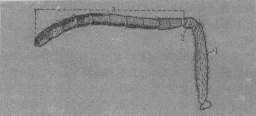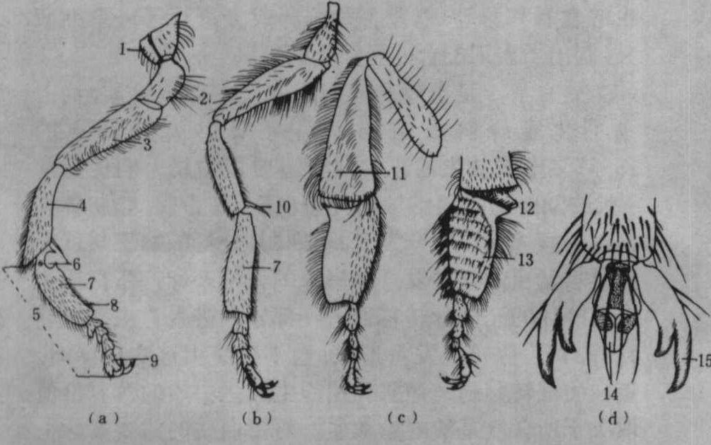 图9 工蜂飞翔(a)、发臭(b)和扇风(c)时翅的扇动情况(仿R.A.Morse) 足 蜜蜂有前、中、后三对足,每足由基节、转节、腿节、胫节及跗节组成(图10)。跗节由五个分节构成,近基部的分节扩大和加长,称基跗节;近端部的分节称跗端节,其上具一对爪和一个中垫。爪可帮助蜜蜂抓住粗糙物体的表面,而中垫能分泌粘液粘着光滑物体的表面。足是主要的运动器官,而一些特化的部分,还有其他用途。由于工蜂是群体中担当“工作”的个体,足上的特化结构尤为典型。工蜂前足比后足短而灵活,基跗节扩大,基部内侧有一个半圆形凹窝,内有一列短毛,并同一个由胫节末端伸到半圆凹窝上的指状突组成净角器,起清洁触角的作用。基跗节上密布硬而长的刚毛,称为毛刷,可清扫头、眼、口器的花粉和其他尘粒。工蜂中足基跗节呈刀片状,密生厚毛,作为清洁胸部的毛刷;胫节末端与跗节接合处有一长距,用于清洁翅和气门。工蜂后足是最大和最长的一对足,胫节呈三角形,外表面光滑而略凹陷,边缘着生弯曲的长刚毛,形成一个可以携带花粉的装置,称花粉筐,蜜蜂采集到的花粉在这里形成团,花粉筐周围丛生的刚毛,有助于固着花粉团。基跗节内侧面具有9~10排整齐的刚毛称刚毛刷、花粉刺,用以将分散于体表的花粉刷集起来。胫节末端与基跗节的上部共同组成一个夹钳,能帮助把收集起来的花粉形成团粒,以便把花粉装入花粉筐内。