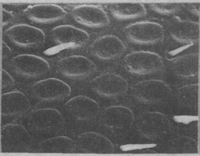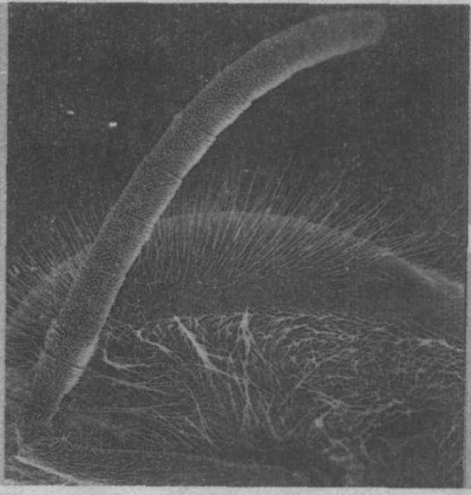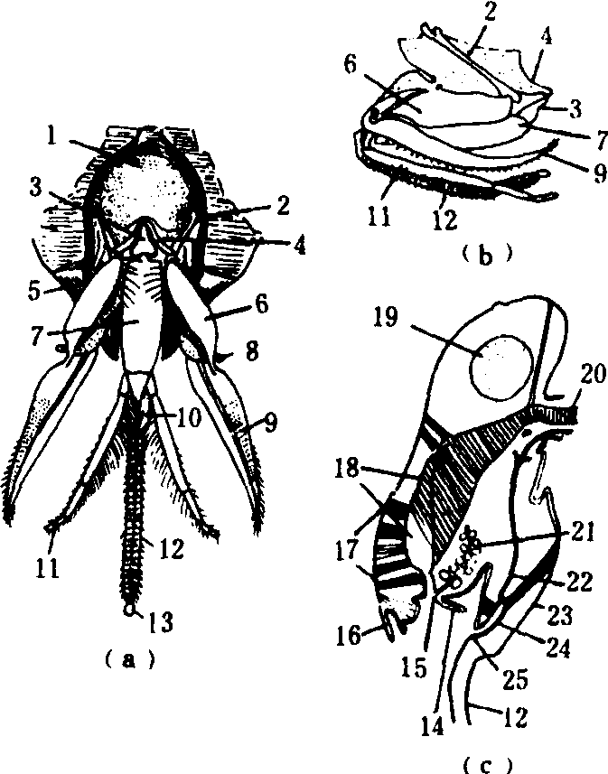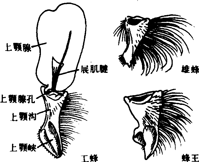 (c) 图3 蜜蜂的触角 眼分为复眼和单眼两种。复眼一对,位于头部两侧,暗褐色,有光泽。复眼由许多小眼组成,相邻小眼间的缝上着生有短毛。单眼三个,呈倒三角形排列于两复眼之间。蜜蜂的视觉是由复眼和单眼协同起作用的。 口器 嚼吸式,分为上部口器和下部口器。上部口器由一对大的上颚和一片呈方形的上唇组成,起咀嚼作用;下部口器由一对下颚和一个下唇组成,并特化形成起吮吸作用的管状喙。 上颚 悬挂在头部口的两边,紧接在上唇基部后面(图2、图4)。每一上颚基部有一凹窝为上颚腔,有前后两个关节联系点与头部连接,并有两条肌肉附着于活动轴的两对面,使上颚能左右活动。蜂王的一对上颚比较发达,粗壮,边缘密生锐利小齿;前部宽,中间小;背面着生长短不一的毛;腹面自中间至端部形成盆状,周围密生一列短毛。蜂王的上颚主要是用于羽化时咬开坚实的茧衣和巢房盖。雄蜂不参加“工作”,上颚也较小,其上部较宽,并着生很长的毛,下端渐渐缩小,腹面自中间起向下端延伸成一狭小的槽,颚端有小齿。工蜂的上颚呈靴状,两端大,中间小,腹面则端部凹陷呈匙状。端部内表面边缘着生细毛的纵形宽槽为上颚峡,与由基部向下延伸的上颚沟相通;上颚腺开口于上颚基部内。工蜂使用上颚咀嚼花粉,嚼蜡造巢,支撑向外伸长的喙以及作为巢内所需各种杂工的一对夹持工具。