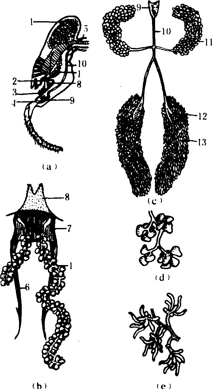 图5 工蜂的喙 上颚腺 位于头内上颚上面,为一对囊状体,开口于上颚基部两侧。工蜂的上颚腺能分泌一些软化蜡质或溶解蜂胶的物质,还能分泌一些生物激素参与蜂王浆的组成。蜂王的上颚腺比工蜂的发达,能产生大量的蜂王物质,在群体中起信息作用。雄蜂的上颚腺退化成小囊。 营养腺 又称舌腺、王浆腺,旧称咽下腺,位于头内两侧,为一对葡萄状的腺体(图6)。工蜂的营养腺非常发达,能分泌一种用来饲喂蜂王、雄蜂和幼虫的营养丰富的乳浆,称为“蜂王浆”或“蜂乳”。营养腺的两条中轴导管分别开口于口底部的口片侧角上。由于口片属于舌,所以营养腺是舌腺,而不是咽下腺。 唾液腺 两对,一对在头内后部脑的上面,称头唾腺,是两串扁平的梨状体;另一对位于胸部,叫胸唾腺,是两串管状体。两对腺体以四根导管通入一条总管,开口于唾液泵,经此泵可把唾液排入下唇腔,再经舌下表面的槽管导至舌尖。胸唾腺是由幼虫期的丝腺发展而来的,头唾腺则是在蛹期由普通唾管派生来的。唾液中含有转化酶,混入花蜜中能促使蔗糖的转化,并可作为糖粒的溶剂。