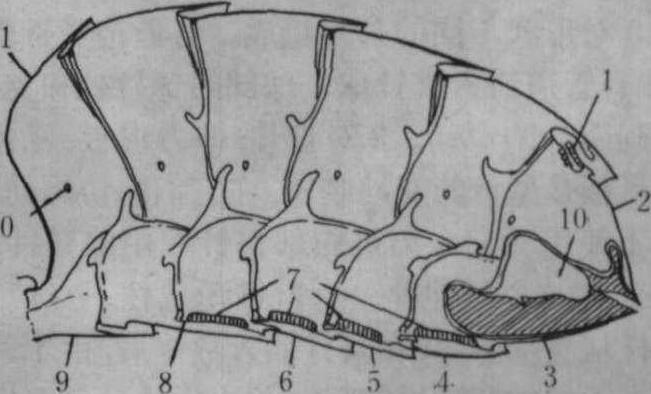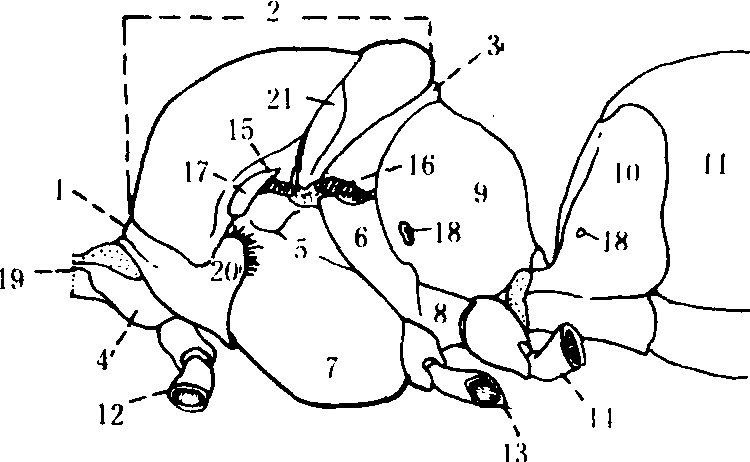 图6 工蜂头部和胸部的腺体 胸部及其附器 蜜蜂成虫胸部由前胸、中胸、后胸三节组成, 后部的并胸腹节是由第1腹节延伸至胸部构成(图7)。胸部三节都具有背板、腹板和侧板, 中胸和后胸各具一对膜质翅。前、中、后胸分别着生前足、中足和后足各一对。胸部骨板的内壁着生有发达的肌肉, 支配着足翅的运动, 胸部是运动的中心。 胸部的构造 前胸背板狭窄, 成颈状, 紧接于中胸盾片前面, 两侧向后延伸形成扁平叶覆盖着第一对气门, 称为气门瓣; 前胸腹板由腹基片和具叉腹片组成; 前胸的侧板和腹板支持着前足。中胸背板由盾片和小盾片组成, 有节间缝与前胸和后胸分开, 盾片和小盾片之间也有外背缝分开; 中胸背板隆起部分向下急剧倾斜至前背板的颈状部; 在翅基之下的侧板和腹板从一边到另一边连成一片。后胸背板为一狭窄的带状骨片, 两侧向下弯成弧形, 紧紧地楔在中胸和并胸腹节之间; 后胸侧板和腹板也连成一片。并胸腹节由一大的背板和狭窄的横形腹板组成, 背板前部宽大,后部突然变窄连着腹柄,背板两侧有一对椭圆形的气门。