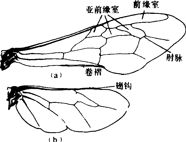 图7 工蜂的胸部及腹部的基部 翅 蜜蜂的中胸、后胸各具一对透明膜质翅(图8),翅上有加厚的网状翅脉,是翅的支架。脉序是系统分类的重要依据。前翅大于后翅,后翅前缘有一列向上弯的翅钩, 前翅后缘有一列向下弯的卷褶, 当飞行时, 前翅卷褶与后翅钩连挂住, 保证前后翅动作一致;不飞行时, 翅水平地向后折叠于体背面。每翅的基部有四块形状各异的腋片, 它们之间互相铰合, 并与胸节连接, 受胸节不同肌肉伸缩的牵引, 产生翅的各种活动或静止状态。蜜蜂的翅除飞行外, 还能扇动气流, 调节巢内的温度和湿度;翅还能振动发声, 作为信号传递。工蜂翅的不同姿态表示不同行为(图9)。蜂王的翅比雄蜂的短, 但比工蜂的长, 雄蜂的翅最大。