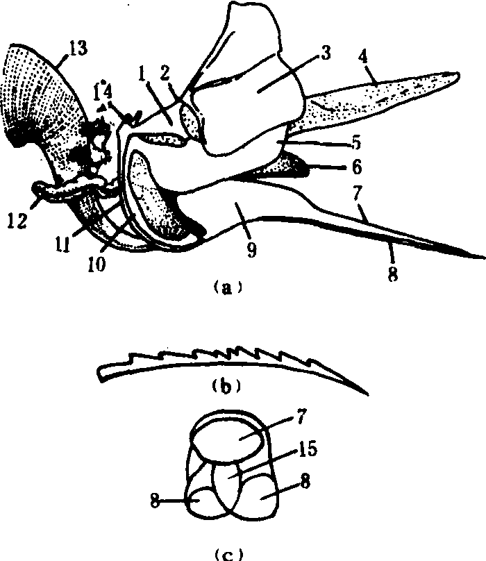 图4 工蜂、雄蜂和蜂王的上颚(仿Snodgrass) 喙 由下颚和下唇的活动部分临时组合形成一条管子,用来吸取液体食物(图5)。下颚延长,位于下唇两侧,基部轴节细长呈柄状,其端部较宽大,基部稍细,并具两个髁突,内侧尖形的一个与喙窝缘相连接;外侧髁突圆钝。轴节末端连接一中央陷入的船形茎节,茎节宽大,为下颚须的最大部分。下颚外侧悬挂着一对已退化的下茎节,端部连接一叶状盔节,为下颚最长部分,基部适与茎节结合,下部伸长,尖形,中有一纵列延伸,把盔节分为不等的两部分。下唇由颏和中唇舌组成。位于后颊基部的喙基片连接于中传轴。下唇的基部为三角形后颏;端部为长筒状的前颏;前颏末端有长而分节并带毛的中唇舌,末端有一圆形的唇瓣;一对短叶状的侧唇舌包围着中唇舌的基部;一对细长的下唇须能单独活动。喙由于轴节的摆动,使用时可向下伸长,并组成长管子;不用时可卷回到头下后面。蜜蜂吸吮液体食物是由位于头内的抽吸器、或称吸泵的复杂结构起作用的。