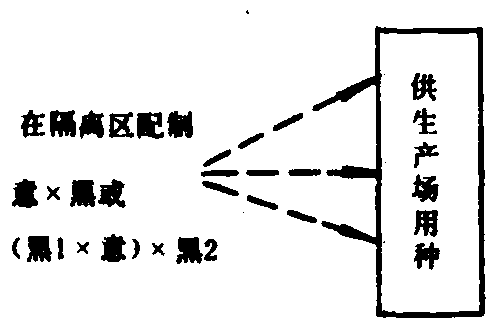 ❷有条件的地区可设立种蜂场(组),每年由种蜂场(组)配制优良杂交组合的产卵蜂王,供生产场直接使用。这种选配和选种方法,可不考虑换种过程中父母本的配合力问题,能采用最适宜的育种材料和杂交方式,培育出杂种优势很显著和生产力很高的杂交组合,迅速大幅度地提高蜂群的产蜜量。(图2)