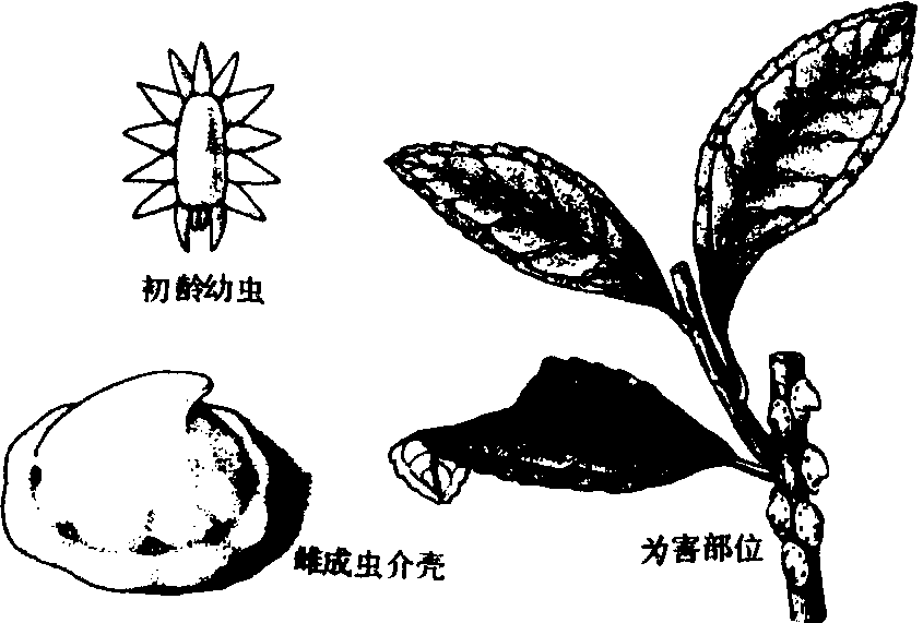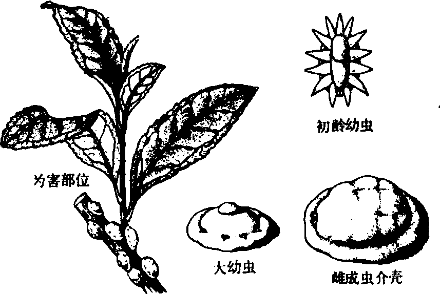 图1 日本龟蜡蚧 生活习性 一年发生一代, 以受精雌成虫越冬。在浙江于次年4月下旬开始产卵, 6月上旬至7月下旬若虫孵化, 6月下旬为盛孵期, 8月上旬至9月中旬雄成虫羽化。据观察, 受精雌成虫秋后陆续缓慢移至枝干上越冬。雌成虫产卵于壳内, 每一雌虫平均产卵500粒左右。若虫孵化后均爬至叶面为害, 并分泌蜡质。已发现能抑制其发生的天敌有一种短腹小蜂和两种软蚧蚜小蜂。 防治 剪除虫口较多的枝条。在雌成虫产卵前用竹刀刮除虫体,在若虫大量孵化后喷施25%亚胺硫磷、50%马拉松、50%辛硫磷、40%乐果、50%二溴磷、80%敌敌畏、50%杀螟松或25%喹硫磷1000倍液,25%溴氰菊酯6000~8000倍液。发生严重的地区应隔15天后, 再连续防治1次。 角蜡蚧 分布与为害 中国各产茶省均有发生。日本、印度、斯里兰卡等国均有分布。主要刺吸枝干、致树势衰退并诱发煤病。为害茶、柑、桔、桃、杏、柿、椿等多种林木。 形态 雌成虫红褐色, 体背显著隆起呈半球形,直径4毫米左右, 腹端有圆锥形突起; 蜡壳厚, 质较软, 灰白色微带粉红, 全体呈半球形, 直径约6~8毫米, 背面中央呈角状突起, 周围有8个小角状突起。雄虫赤褐色,体长约1毫米, 一对翅透明。卵椭圆形,长径约0.3毫米, 初为肉红色, 后转红褐色。若虫初孵时长椭圆形, 体长约0.34毫米, 红褐色; 2龄后呈卵圆形, 体长约1.2毫米; 3龄雌若虫体长约1.6毫米。蛹赤褐色, 长椭圆形, 长约1毫米,雌若虫蜡壳近圆形,中央有一角状突起略向前倾;雄若虫蜡壳长椭圆形, 周围呈芒状蜡突。