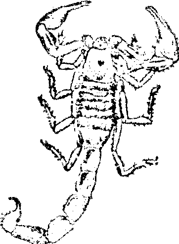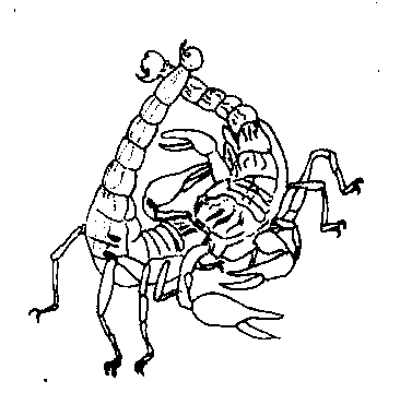 图 158 蝎 蝎Xie节肢动物门蛛形纲的种类,已知有800多种。体长,背腹扁平,分为头胸部和腹部。头胸部附肢6对,第2对须肢发达;前腹部宽,后腹部窄,末端具尾刺,可分泌毒液。蝎陆栖,夜行性,肉食性。其后腹部通常弯向体背,随时准备捕杀猎物,如昆虫、蠕虫等。蝎亦螯人,人被螯后局部皮肤红肿疼痛,还会引起头晕眼花、出冷汗等全身性反应热带地区生活的大型蝎子(体长可达200多毫米)螯人后可致人于死命。我国分布的蝎类一般在30—90毫米。蝎具残食习性,雌蝎在交尾后通常吃掉雄蝎。卵胎生,初产幼蝎常爬在母蝎背上。全蝎、蝎梢(去毒的尾部)和蝎毒均可入药,治疗多种疾病。在我国已人工养殖。
