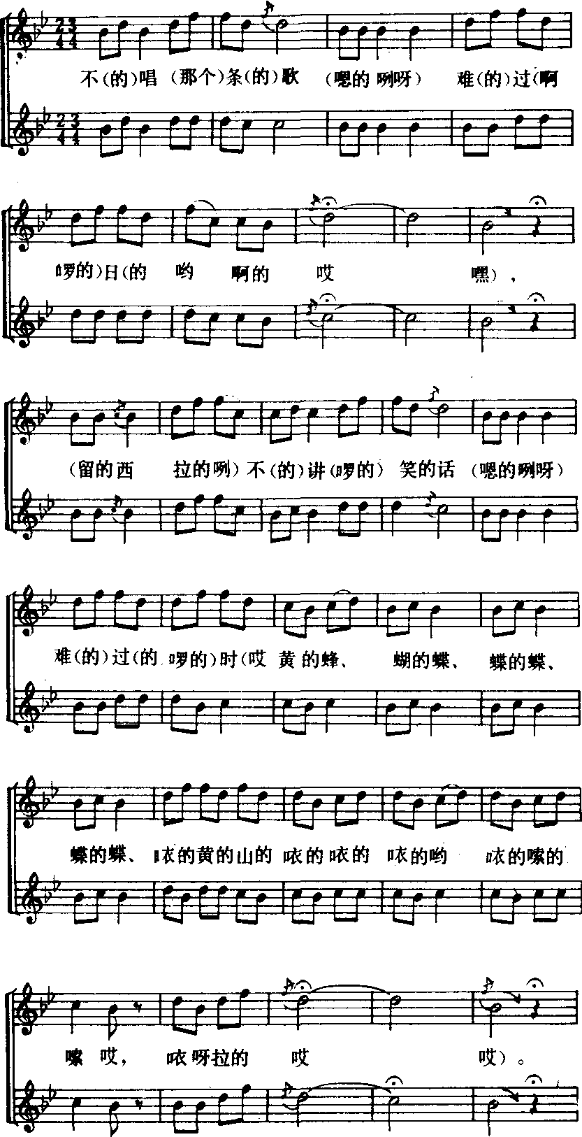 | 释义 | 蝴蝶歌瑶族民歌。位于广西、湖南、广东交界地区的瑶族“平地瑶”同胞(因居住于平原地区而得名,与“排瑶”和“过山瑶”有区别),有一种独特的同声二重唱民歌,称作蝴蝶歌。它的歌词,多为七言四句体,有时,在第三句之后要加一个扩充的五字句。演唱时字多腔简,采用繁密而有风趣的衬词,如“留的西拉的咧”、“蝴的蝶”、“黄的蜂”等,因此,歌手们也自称这种歌为“蝴的蝶歌”或“蝴蝶蜂歌”。例如,一首蝴蝶歌原词为“不唱支歌难过日,不讲笑话难过时,一年三百六十日,不比一天同一时”。经过加衬词演唱,却是洋洋洒洒,成为“不唱支歌难过日,留的西、拉的咧,黄的蜂、蝴的蝶……不讲笑话难过时,一年三百六十 日,日月同样过,留的西、拉的咧,黄的蜂、蝴的蝶……不比一天同一时”,十分生动活跃。蝴蝶歌的音乐特色鲜明,活跃欢快,热情洋溢而一气呵成。二声部中,其高声称“抛高”,低声称“旋下”,音程多用大2度,以及大小3度和纯4度,结尾时由平行大2度“碰唱”到同度的宫调式主音,构成别致的终止式。 不唱条歌难过日(蝴蝶歌) 湖南江华瑶族民歌