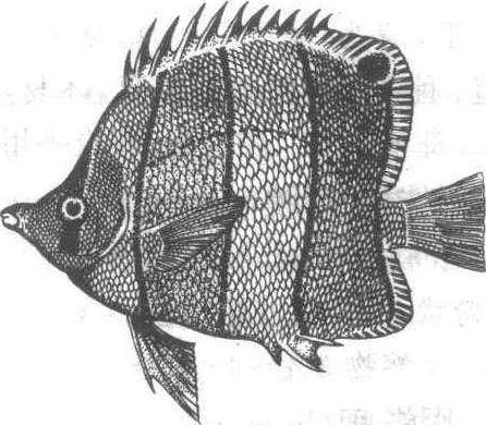 | 释义 | 蝴蝶鱼butterfly fishes硬骨鱼纲,鲈形目,蝴蝶鱼科(Chaetodontidae)鱼类的通称。长约10~20 cm。体侧扁而高,呈卵圆形、椭圆形或菱形。头小。吻短或尖突。口小,前位,略能伸缩。牙细小,刚毛状或刷毛状。背鳍1个,尾鳍圆形或截形。体被小栉鳞。为一群生活于热带珊瑚礁中的小型鱼类。体色鲜艳。以珊瑚及小型甲壳类为食。有些种类在发育过程中要经过一个特殊的幼鱼期,其外形或体色与成鱼不同。某些种类个体较大,有一定的食用价值。常见的有朴蝴蝶鱼(Chaetodon mo-destus)、副蝴蝶鱼(Parachaetodon ocellatus)、霞蝶鱼(Hemitau-richthys zoster)、少女鱼(Coradion chrysozonus)和镊口鱼(For-cipiger longirostris)等。