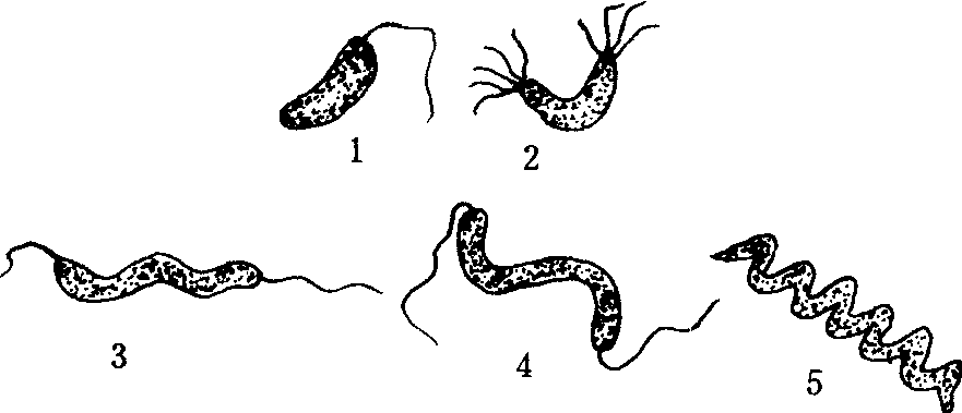 螺旋菌spirillum一类形体弯曲呈螺旋状的细菌,简称螺菌。螺距的大小,螺旋的多少因种而异。细胞弯曲不足一圈的称弧菌(vibrio),形同逗号。螺旋菌细胞壁坚韧(与螺旋体胞壁柔韧相区别),其细胞大小以菌体长×宽(直径)表示,一般为0.3~1.7μm×2~60 μm。革兰氏阴性。有单根或束生的鞭毛,着生在菌体的一端或两端,能活泼运动。好氧或微量好氧。常生活在淡水或海水中。 |