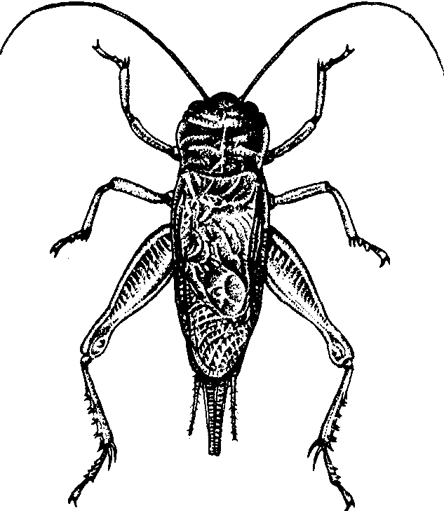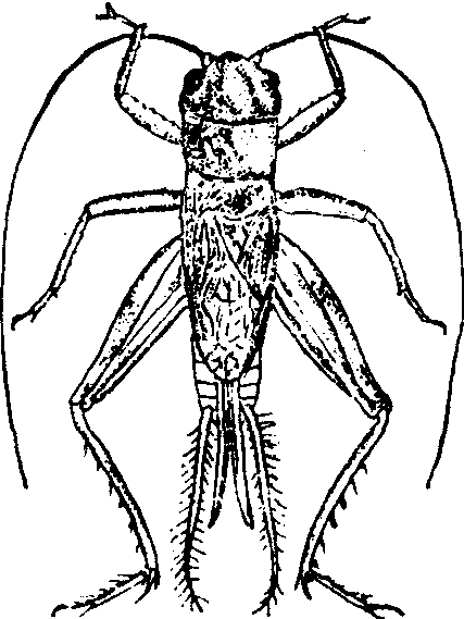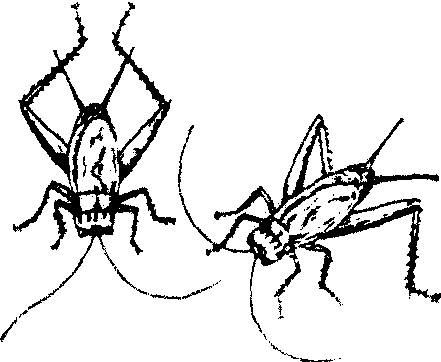 图172 蟋蟀 蟋蟀crickets偶发性农业害虫。直翅目,蟋蟀科昆虫的统称。全世界已知2 300余种,中国约120余种,广布型。体长2~40毫米,黑褐至赤褐色,也有部分种类为黑色、黄色或淡绿色。头圆,胸宽,触角细长多节,超过腹端。前后翅发达,但也有的全缺或较短; 前翅前方骤然向下弯曲,平覆体面及身体两侧,右翅在上,左翅在下,后翅折叠于前翅下,多数种类雄虫前翅具发音器,它由翅脉上的小刮片,摩擦脉及发音镜组成。前胫节基部具听器,后足发达,善跳跃,跗节3节。产卵管细长,针状或矛状,腹端有尾须一对,长而无节。