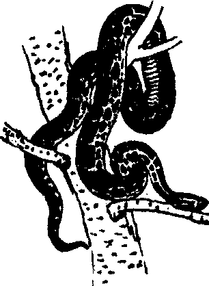 图297 蟒蛇 蟒蛇mexcan burrowingPython molurus bivittatusSchlegel,爬行纲,有鳞目,蟒蛇科。中国蛇类中最大的一种,无毒。长可达6~7 m。体长粗壮,头颈区分明显,尾短。泄殖腔两侧有一对爪状结构,是后肢退化的残迹。头背有成对大鳞片和多数细鳞;吻鳞及前两枚上唇鳞具唇窝;背鳞平滑,中段65~72行;尾下鳞为双行。背面灰棕色或黄色,背脊及两侧均有大块镶黑边的云豹状斑纹;头颈部背面有一矛形斑;腹面均为黄白色,但在躯干及尾腹面杂有少数黑褐色斑。生活于热带、亚热带森林中,善攀援,亦栖于水中。夜间活动,捕食蛙、蛇、鸟、鼠等,也能绞死、吞食10 kg重的哺乳动物。卵生。雌蛇有缠卵孵育的习性。寿命可达25年以上。分布于中国南方诸省;也产于印度、斯里兰卡和东南亚一带。列为中国一级保护动物。