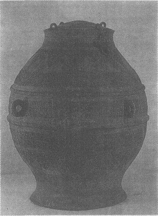 | 释义 | 蟠虺纹大铜缶战国·曾。古代容酒、水器。通高130厘米,腹围110厘米。重361.5公斤。1978年夏湖北随州市擂鼓墩曾侯乙墓出土。湖北省博物馆藏。铜缶出土于曾侯乙墓北室,有形制、大小相同的两件,唯重量各异,另一件为320公斤。其中一件现藏北京中国历史博物馆。敛口,上有盖,盖上有四环钮和两组纹饰,盖边的环钮上有链联在缶肩部的环钮上。溜肩,上饰三角形蟠虺纹和一周蟠虺纹带。鼓腹,上、下有凸弦纹,间有蟠虺纹带和四个环钮。下腹与肩基本相同,纹饰为二周蟠虺纹带,下连假圈足,平底。曾侯乙墓铜缶,体形、重量之巨,是仅次于商代“司母戊”铜鼎的又一先秦青铜重器。