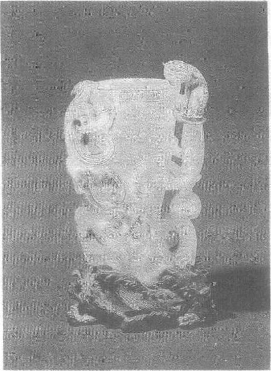 | 释义 | 蟠龙玉觥宋。高15.4厘米,径8.5厘米。台北故宫博物院藏。玉质为白色,上有褐红色斑。觥是一种酒器,此觥形制似犀角,上粗下窄。口沿阴刻回纹一周,器身饰隐起云纹,外壁浮雕三蟠螭:一只引颈,头探向口内,作器物之柄;另外两只借玉料上的褐红斑巧作而成,色泽十分醒目。器底有一龙头。全器雕琢精细,古朴中透出艳丽,是台北故宫博物院宋代玉器藏品中的优秀代表。