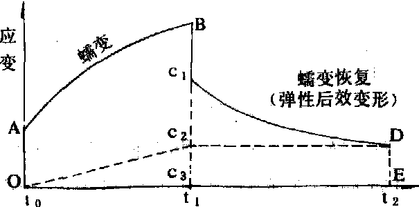 | 释义 | 蠕变creep木构件在恒定荷载作用下,变形随时间的推移而缓慢增加的不平衡过程。木材的变形与以时间为函数的关系即蠕变曲线(见图)。在时间t0开始施加力,便立即产生相应的瞬时弹性变形OA,力保持恒定,随之产生了迟延的变形(蠕变)AB。直至时间t1卸载后,就会产生瞬间弹性回复BC1(=OA),随之是迟延部分的蠕变回复(从C1至D至时间t2)。恢复的变形是C1、C2,在时间t2之后进一步恢复就不明显,可忽略不计,于是DE就是加荷至卸荷循环终结时残留的永久变形。蠕变曲线AB包括了两个分量,这两部分在蠕变复原时可以分开,即可逆的和产生弹性后效的初期蠕变C1、C2以及不可逆的产生塑形变形的后期蠕变C2、C3木材蠕变甚至在很低的应力下也可以发生,并能继续至几年之久;如施加适当的荷载于木构件,最终将导致破坏,这种现象称荷载的持久性。