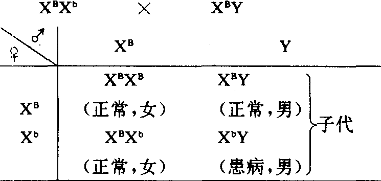 | 释义 | 血友病xueyou bing以凝血机制发生障碍为主要特征的出血性遗传疾病。一般说的血友病,指的是甲型血友病。患者血浆中缺少一种凝血物质——抗血友病球蛋白。因此,纵使轻微碰伤,也可能引起大出血而死亡。血友病属X隐性遗传病(参见“X隐性伴性遗传”条)。令一女子的基因型为XBXb,一男子的基因型为XBY,其中XB和Xb分别代表X染色体上存在正常基因B和致病基因b。他们结婚后子代的表现为:
