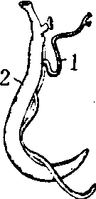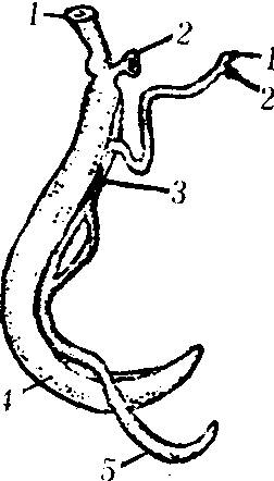 血吸虫 1.口吸盘;2.腹吸盘;3.抱雌沟;4.雄虫;5.雌虫 |