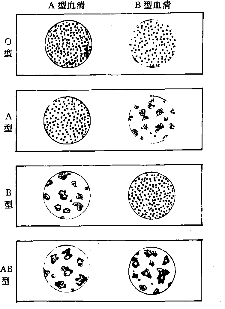 白细胞血型 人类白细胞含有四组称为主要组织相容性抗原的血型物质,即HLA-A、HLA-B、HLA-C和HLA-D。前三种抗原存在于多种白细胞上,但HLA-D仅存在于B淋巴细胞和单核细胞、巨噬细胞上。此外,白细胞含有自身特有的抗原,如嗜中性粒细胞含有NA1、NA2与NB1抗原。这些都是白细胞血型划分的依据。 血小板血型 人类血小板上的血型物质可分为三类: ❶与红细胞相同的抗原,如ABO血型系统的抗原; ❷与白细胞及其他组织相同的主要组织相容性抗原,但血小板不含有HLA-D; ❸血小板自身特有的抗原。 虽然体内血型物质很多形成不同的血型系统,但以红细胞血型研究最为透彻,所以当言及血型时若无特殊说明即指的是红细胞血型。 血型的应用 血型由遗传基因决定,并且和生产性状可能有一定的相关性,所以常用血型作为选育良种的参考指征。血型遗传符合遗传规律,可用来进行亲子关系的鉴定和血统登记,防止血统混乱,保证育种的可靠性; 利用血型可研究家养动物与野生原种之间类缘关系及野生动物的进化和驯化历程。掌握不同血型的相互关系,可以避免异型输血时发生输血反应。动物的组织器官移植中的免疫排斥反应,是由于受体的白细胞特别是淋巴细胞产生对移植组织和器官的免疫抗体所引起。所以要防止排斥反应,除了一般的血型即红细胞血型要相合外,白细胞的血型也要相合。 血型xuexing人类血液的类型,是根据人类红细胞表面所含凝集原的不同来划分的。现已发现有十几个血型系统。如ABO、Rh、MN等血型系统,其中ABO、Rh血型系统在实践中具有重要意义。在ABO血型系统中,红细胞表面含有两种不同的凝集原,分别称为A和B凝集原。与此相对应,血清中就有两种不同的凝集素,分别称为抗A和抗B凝集素。它们是这样分配的:红细胞只含有A凝集原的,称为A型,其血清中含有抗B凝集素;红细胞只含有B凝集原的,称为B型,其血清中含有抗A凝集素;凡红细胞含有A和B两种凝集原的,称为AB型;其血清中既没有抗A也没有抗B凝集素;凡红细胞中A和B两种凝集原都没有的,则称为O型,其血清中含有抗A和抗B两种凝集素。因此,ABO血型系统可分A、B、AB、O四种血型。其中A凝集原不能与A凝集素相遇,B凝集原不能与B凝集素相遇,否则血液相互会发生凝集反应(红细胞粘聚在一起)。将受检者的血液经适当稀释分别滴入A型标准血清和B型标准血清中,根据出现凝集现象的情况即可鉴定受检者的血型(见图)。若红细胞不被A型血清和B型血清凝集,则此人的血型为O型;若红细胞不被A型血清凝集,被B型血清凝集,则此人的血型为A型;若红细胞被A型血清凝集,不被B型血清凝集,则此人的血型为B型; 若红细胞既被A型血清凝集,又被B型血清凝集,则此人的血型为AB型。近年来的研究发现,在某些特殊情况下,如患消化道肿瘤、新生儿或青年期免疫功能低下等,血型还会起变化,说明血型并不是终生不变的。 ABO血型系统中的抗原和抗体