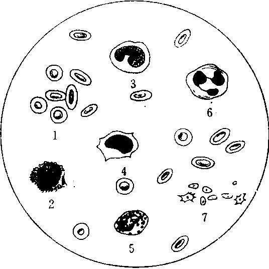 1.红细胞 2.嗜酸性粒细胞 3.单核细胞 4.淋巴细胞 5.嗜碱性粒细胞 6.中性粒细胞 7.血小板 人体血细胞涂片 各种血细胞的寿命不同, 其中红细胞约为120天,白细胞较红细胞短,血小板最短仅几天。正常情况下血细胞的生长与破坏是相对平衡的, 血细胞数目保持相对稳定。血细胞生成的主要部位是红骨髓。幼儿期, 几乎全身骨髓都具有造血功能。7岁以后, 长骨骨干中的红骨髓仍具有造血功能。但长骨骨骺、扁骨和短骨中的红骨髓终生保持造血机能。若红骨髓造血功能减弱,或造血原料缺乏,将影响血细胞的生成(缺乏维生素B1 2、叶酸、铁或蛋白质等,红细胞生长将发生障碍,致使血中红细胞数目减少, 引起贫血)。 血液的主要功能是:❶运输(如运送氧和养料)。 ❷维持内环境中的各种理化因素的相对恒定 (如血中具有能中和酸和碱的物质, 它们在一定范围内缓冲血液的酸碱变化)。 ❸防御和保护(如参与免疫和止血、血凝反应等)。 血液流动于心脏和血管内的液体,呈红色,不透明,有一定的粘稠性,比重为1.050—1.060,pH值为7.4。主要成分为血浆、红血球、白血球和血小板。血液内含有各种营养物质、激素及酶类等,对调节体内代谢,维持水、电解质和酸硷平衡,增强免疫及防御机能均有重要的作用。人体各器官的生理和病理变化,均可引起血液在量和质方面的改变,故血液检验在临床上有很重要的意义。参见“生物”中的“血液”。